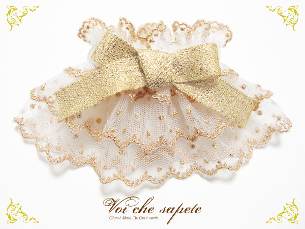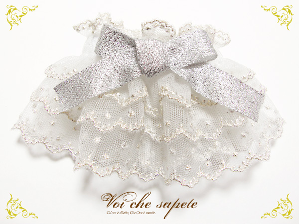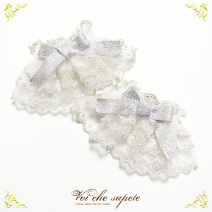 ラメ糸の織り込まれたレースを使用した、動くたびに煌めくお袖とめです。